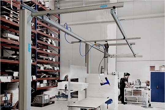 The eepos one aluminum slewing cranes also use the components from the eepos one modular system. Available as a pillar or wall slewing crane, the jibs can be up to 6 meters long and offer a load capacity of up to 500 kg. The assembly using high-load anchors is quick, uncomplicated and clean.